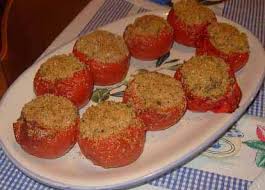 Con questo impasto riempite i pomodori e disponeteli poi in una pirofila bassa e imburrata. Cospargete l'impasto con formaggio grattuggiato e pangrattato, passare in forno medio (180°) già caldo e cuocere per 15-20 minuti.